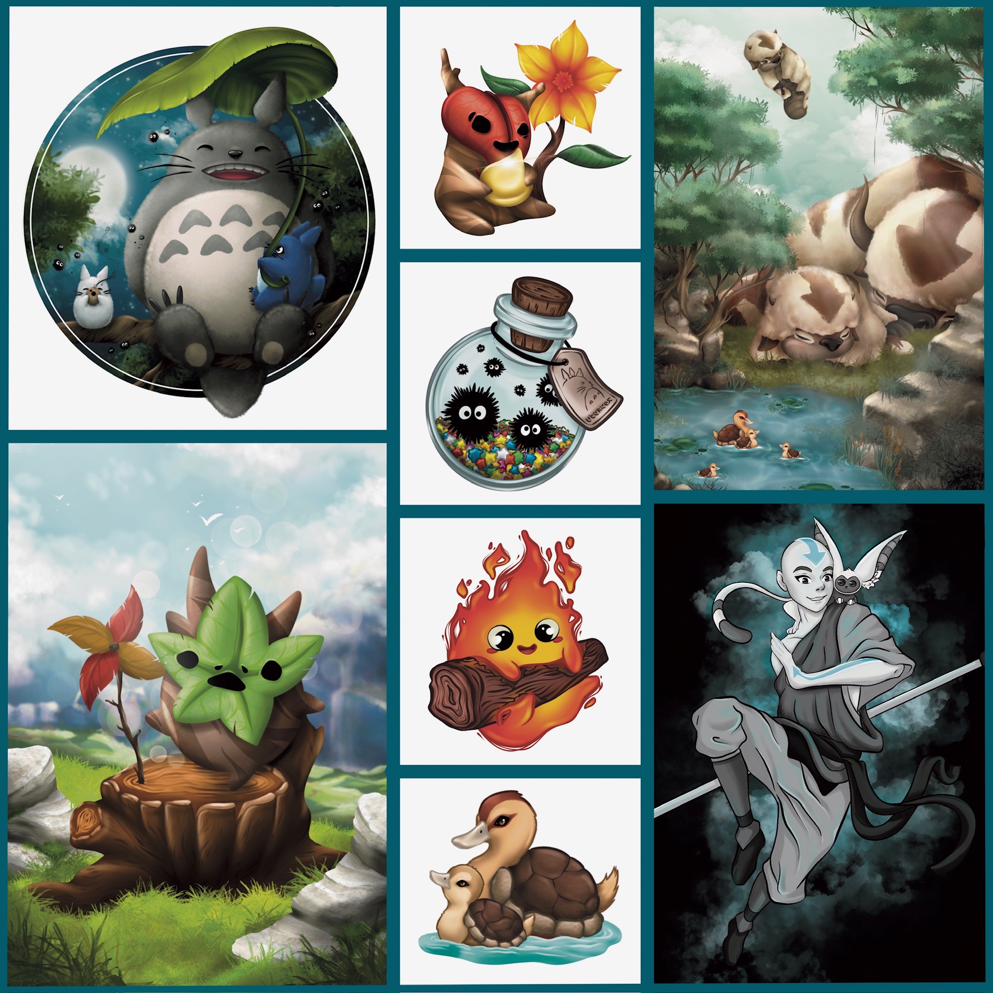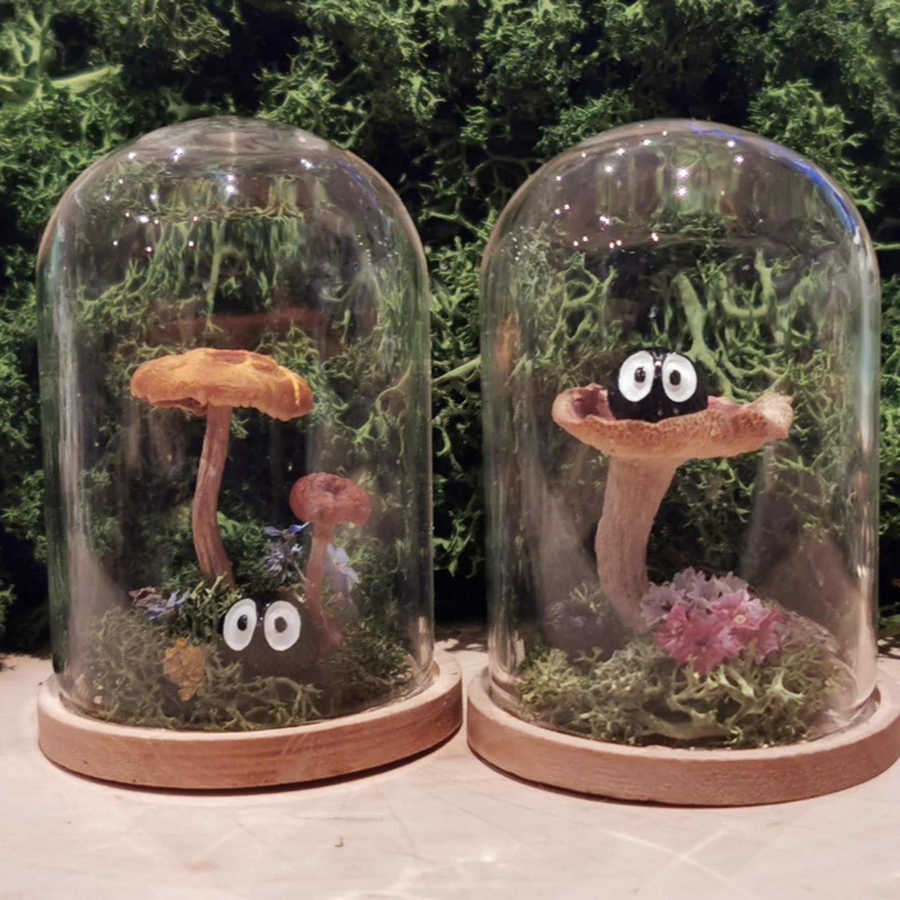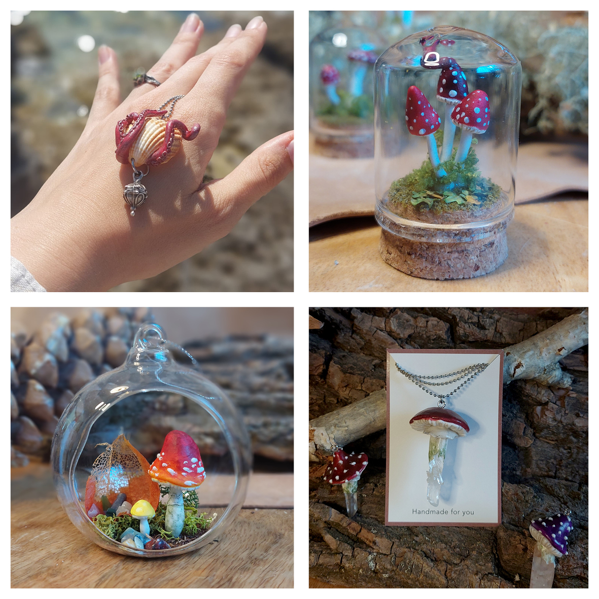 Sticker, Magnete, Ohrringe im Anime-Style oder Comic-Style, Miniaturwelten mit echten Pilzen und Blumen, Schlüsselanhänger, Halsketten.