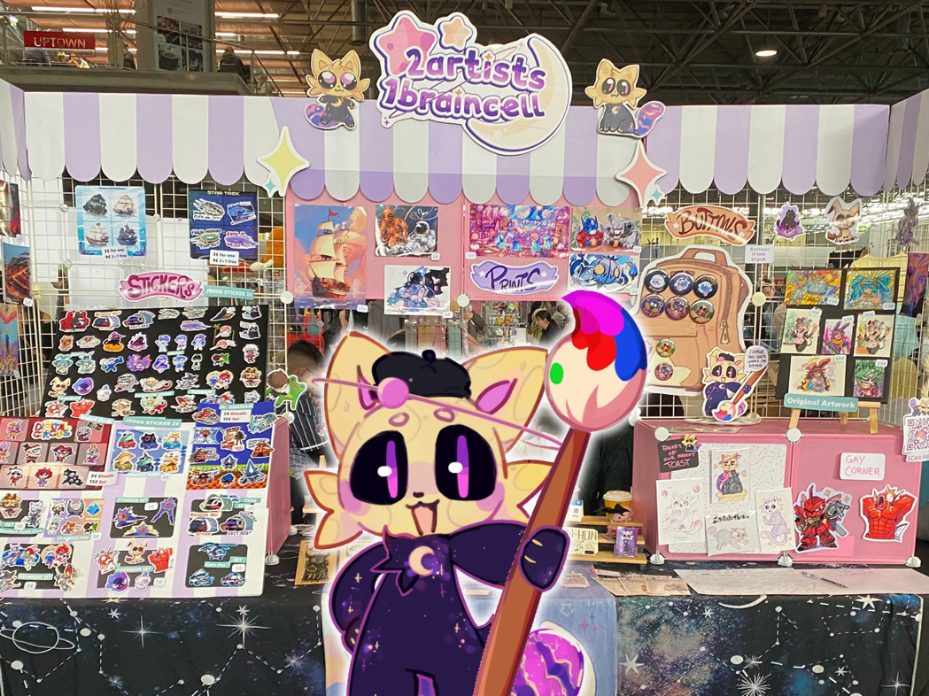 Live-Commissions, Kunstdrucke, Indie-Bücher & Comics, Buttons, Sticker, Acryl-Keychains.