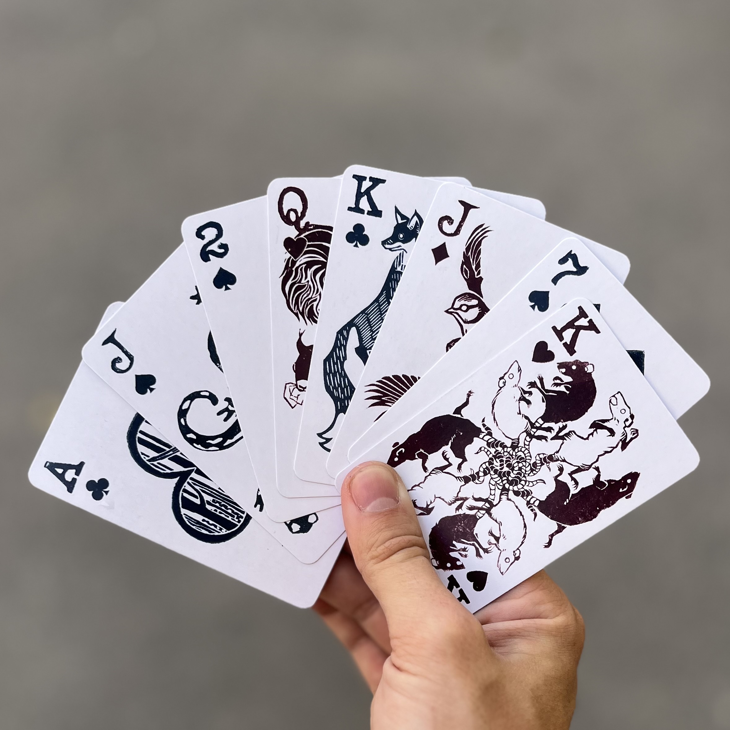 Linoldrucke, handgemachte Kartendecks, Art Prints, selbstillustrierte Comics.